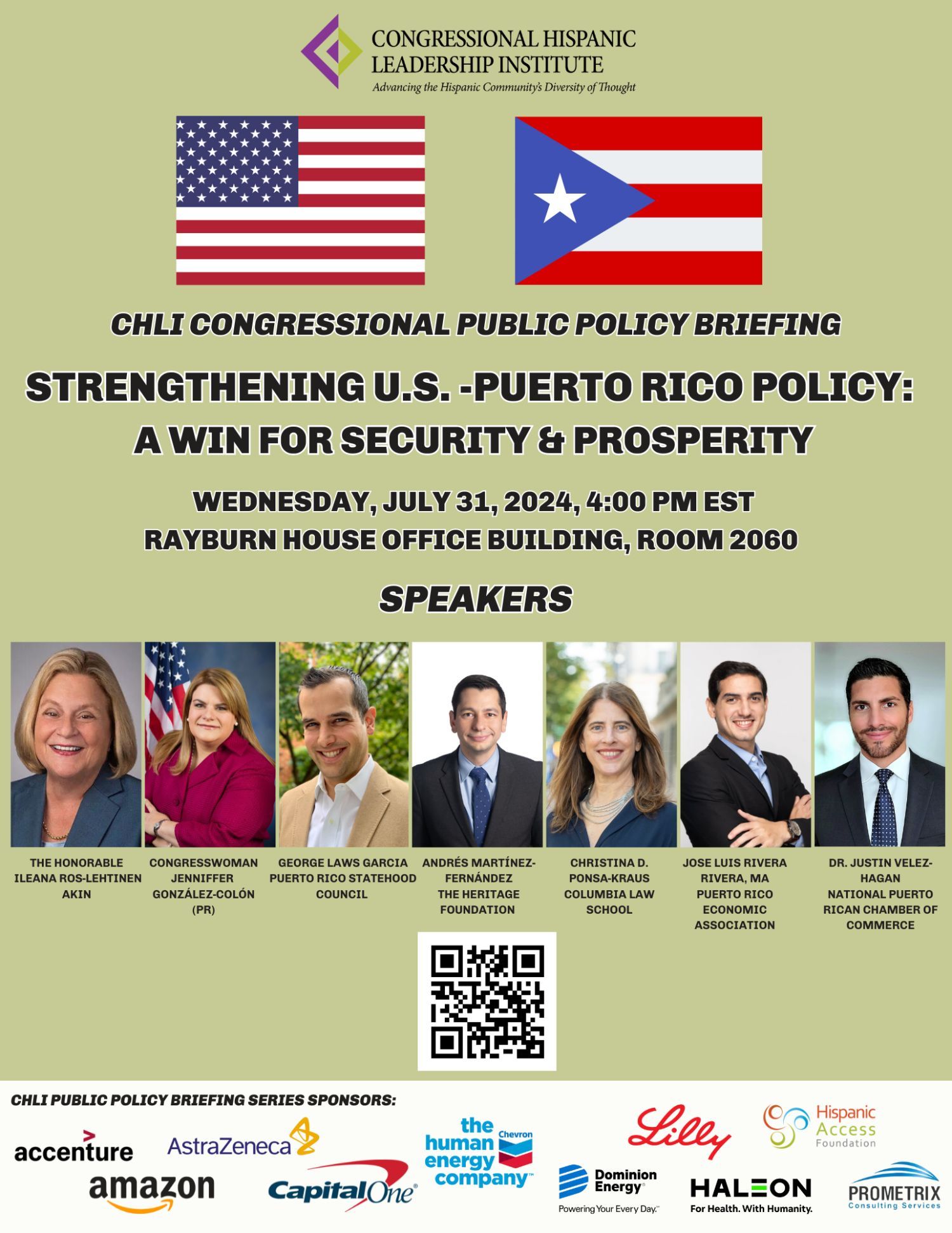 | Please join us on Wednesday, July 31st at 4:00 pm ET, for the Congressional Hispanic Leadership Institute (CHLI) Public Policy Briefing on Puerto Rico titled "Strengthening U.S. - Puerto Rico Policy: A Win for Security & Prosperity." The briefing will feature opening remarks from CHLI Chairwoman and Fmr. Congresswoman, Hon. Ileana Ros-Lehtinen, and Puerto Rico's Resident Commissioner, Hon. Jenniffer González-Colón. For the panel discussion, host and the Executive Director of the Puerto Rico Statehood Council (PRSC), George Laws Garcia, will be joined by experts to delve into issues of economic development, commerce, trade, technology/innovation, national security, and how all of it connect to the island's political status. The panelist will include the following: